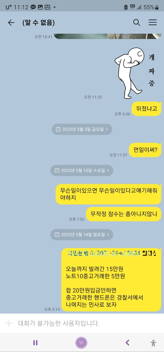 아직 퇴직금이 정산 안돼서 폰요금이 밀리게 생겼다며 별생각 없이 15만 원을 빌려주었습니다